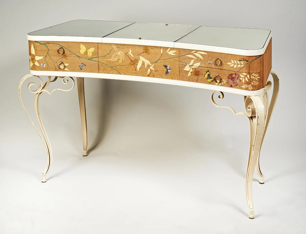 The concave mirrored top with a lifting central panel reveals an open well of four compartments richly veneered. The four flanking drawers with bronze ring handles and with incised and applied-gesso decoration of flowering branches, butterflies and birds, the wholes resting on a scrolling, painted wrought iron base.