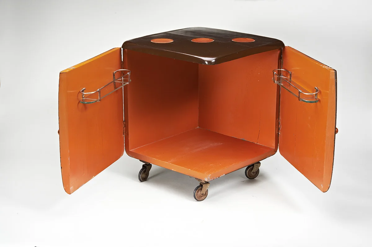 A stool or occasional table in the form of a dice. Two sides open with steel and glass shelves for glasses.