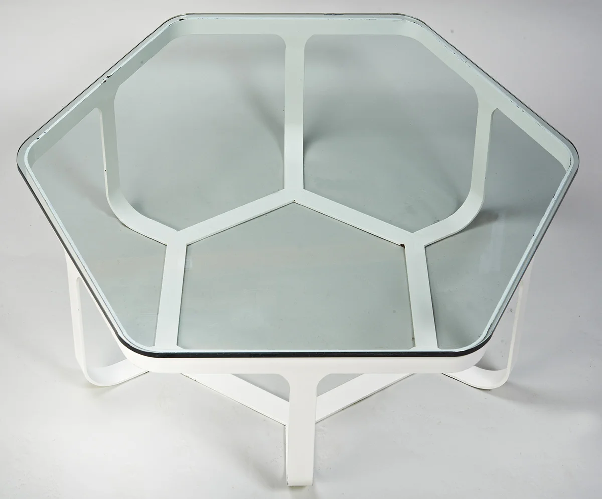 A painted metal frame of honeycombe design, and showing the contemporary influence of Sci Fi and films such as 2001 Space Odyssey. With a toughened-glass top.