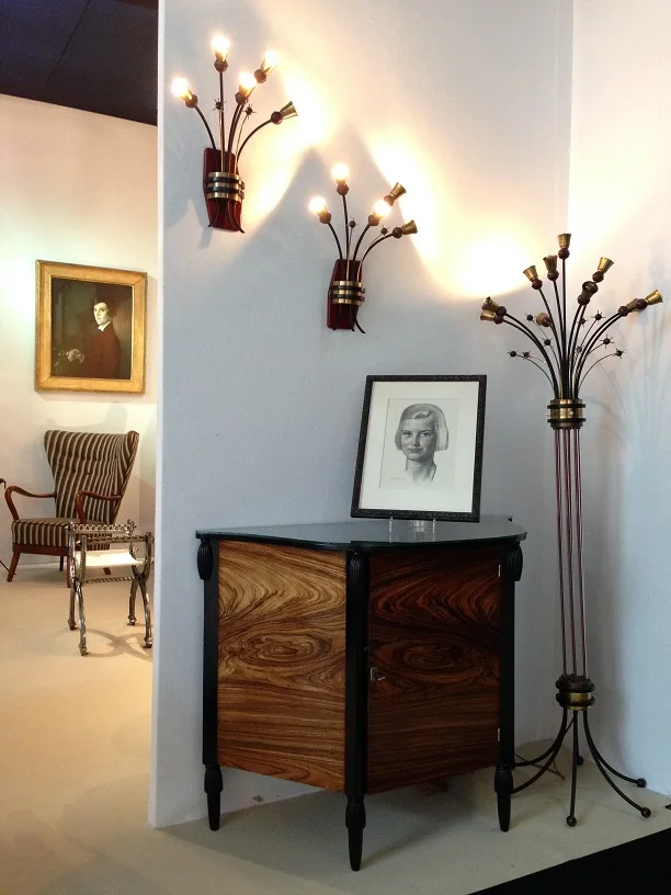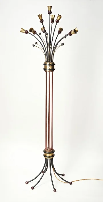 A striking and unusual pair of wall lights and matching floor lamp. The floor lamp has out-swept iron arms, each terminating in maroon formica spheres and turned brass cups. Contrasted with this are smaller decorative brass arms with spiked spheres, resting on six glass rods above a similar brass receiver and out-swept iron legs. The lamp has four switches allowing for varying degrees of brightness.